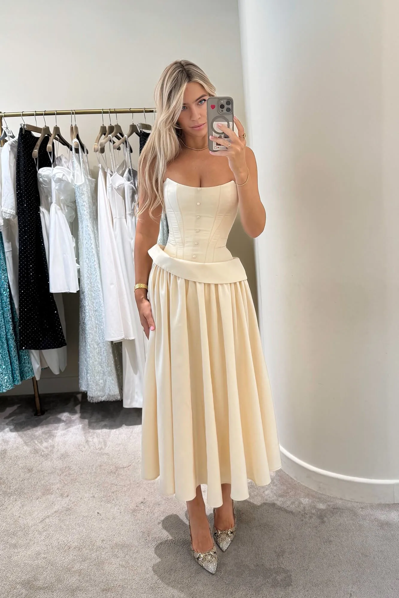 Эффектный комплект из корсета и юбки-миди в нежном кремовом оттенке. Корсет-боди на пуговицах подчеркивает линию декольте и моделирует фигуру, а пышная юбка с отворотом добавляет образу женственности и нежности.