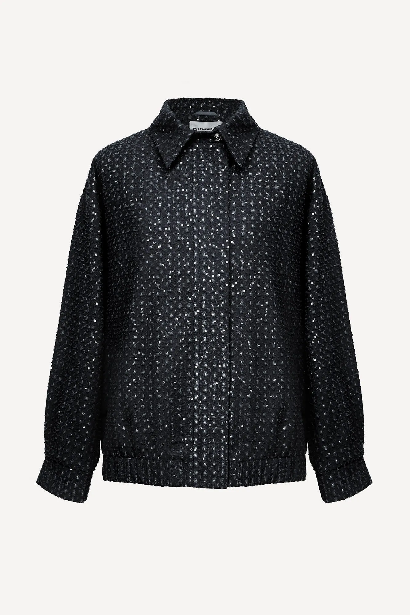 Куртка-бомбер изготовлена из плотного денима в черном цвете с декором из пайеток, который создает эффектный вид. Крой оверсайз с застежкой-молнией и отложным воротником обеспечивает комфорт и свободу движений, а боковые карманы добаляют функциональности. Куртка идеально сочетается с леггинсами, брюками и джинсами, а также может быть дополнена массивными ботинками или сапогами для создания стильного образа.
