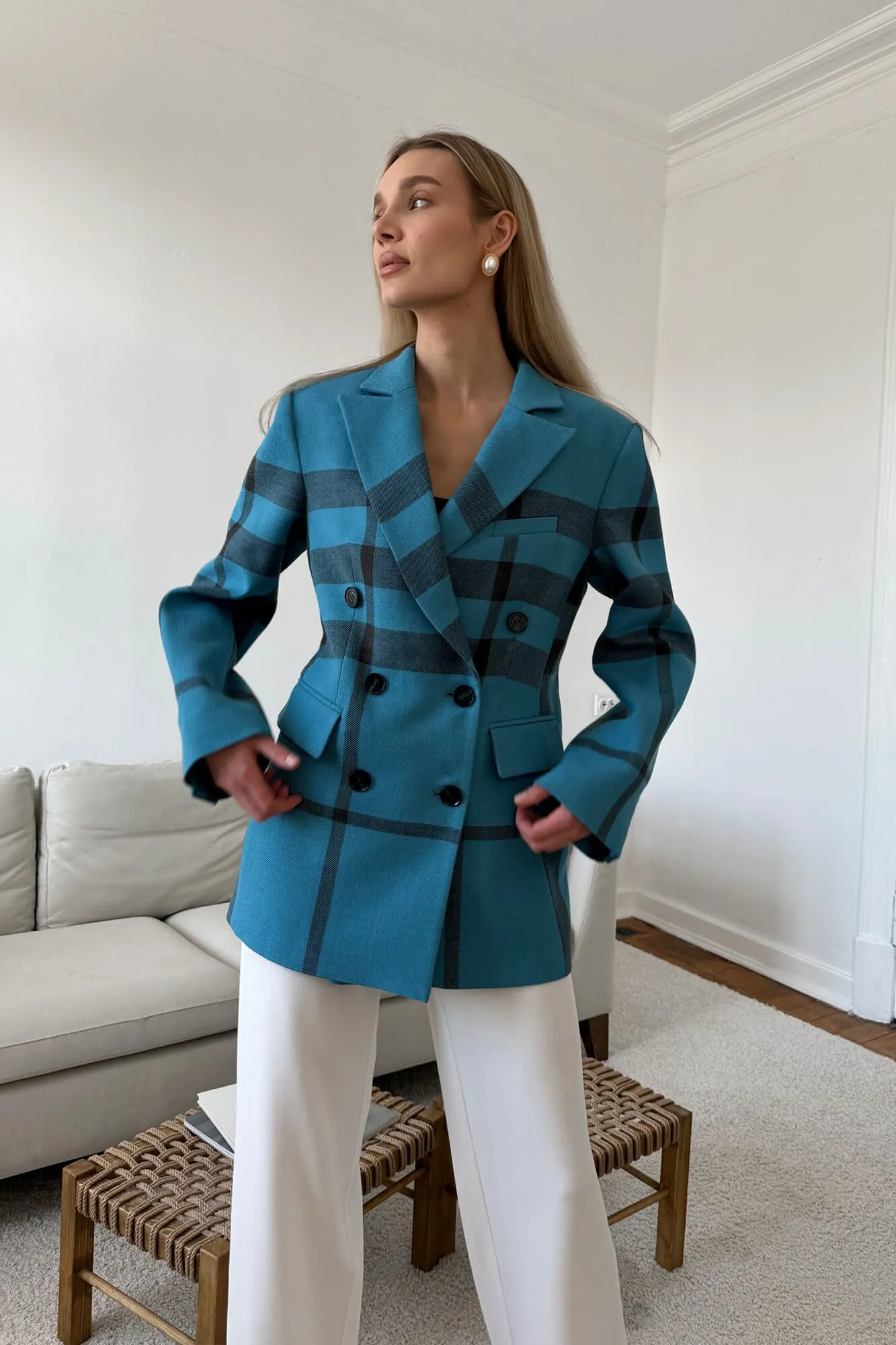 Двубортное укороченное пальто-жакет на пуговицах серо-бирюзового цвета в клетку. Воротник с лацканами пиджачного типа добавляет в образ строгость и элегантность, а свободный крой делает модель удобной и комфортной в повседневной носке. Стилизуйте с брюками из нашей новой коллекции или джинсами для уютного осеннего образа.