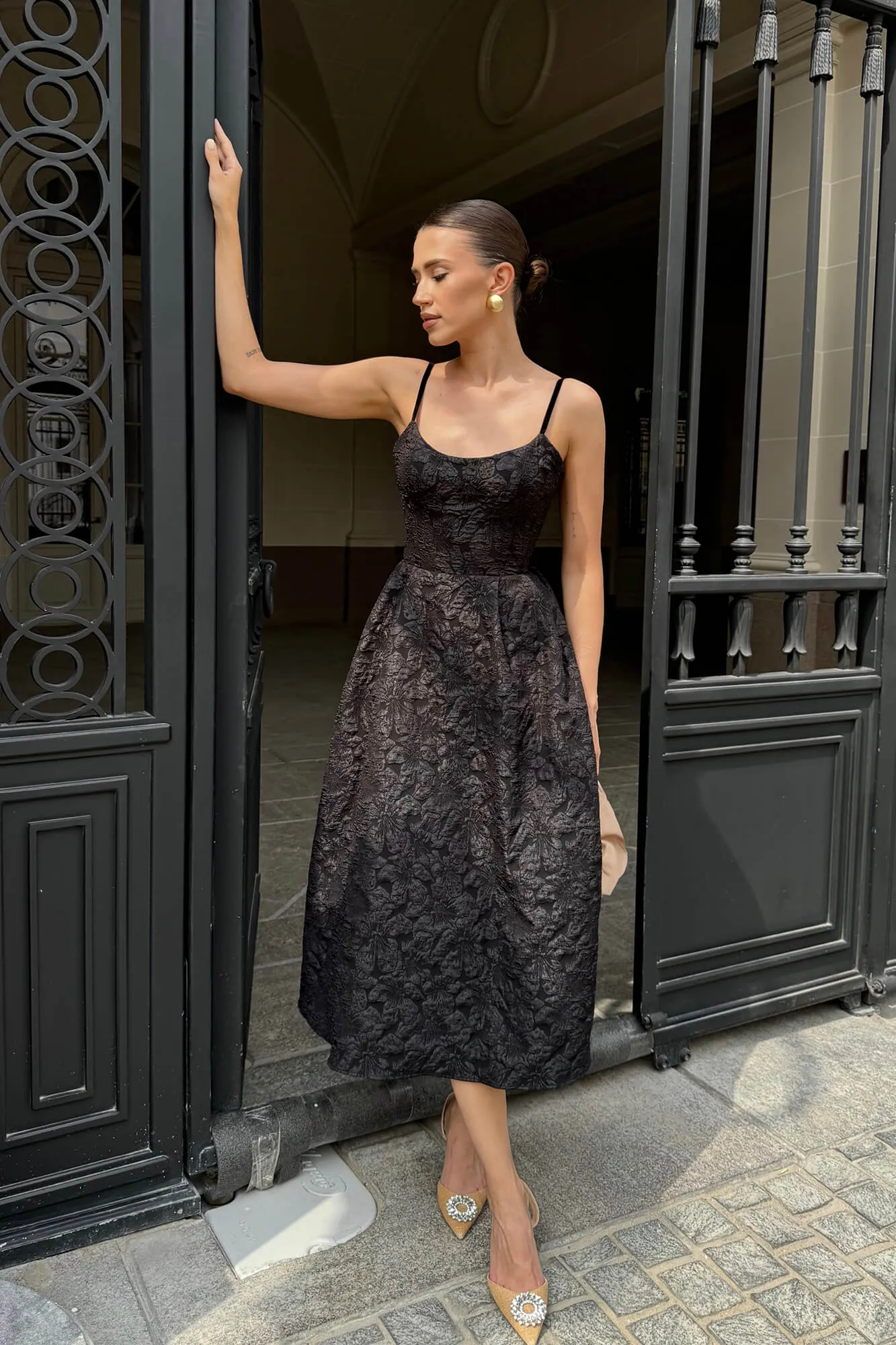 Платье-бюстье в длине миди с тонкими бретелями в черном цвете. Модель выполнена из фактурной жаккардовой ткани, которая может похвастаться хорошей прочностью и стойкостью к изнашиванию. Изделие из такой ткани необычайно долго сохраняет свой первоначальный вид. Аккуратный вырез, который подчеркивает линию декольте. Корсетная основа создает акцент на талии. Пышная юбка добавляет образу лёгкости и воздушности. Прекрасным дополнением станут вечерние лодочки и клатч.