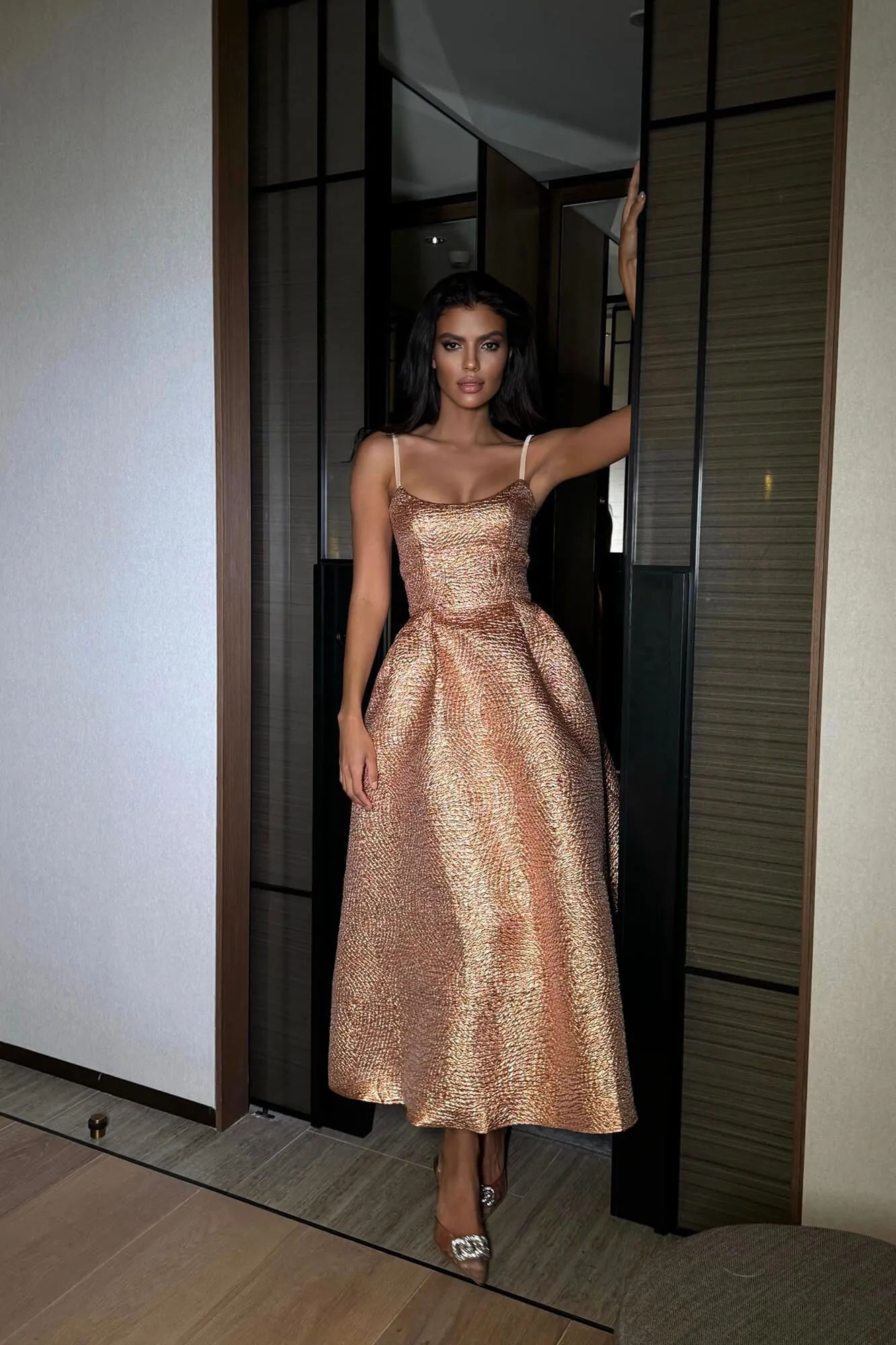 Платье-бюстье в длине миди с тонкими бретелями в золотисто-медном цвете. Модель выполнена из фактурной жаккардовой ткани, которая может похвастаться хорошей прочностью и стойкостью к изнашиванию. Изделие из такой ткани необычайно долго сохраняет свой первоначальный вид. Аккуратный вырез, который подчеркивает линию декольте. Корсетная основа создает акцент на талии. Пышная юбка добавляет образу лёгкости и воздушности. Прекрасным дополнением станут вечерние лодочки и клатч.