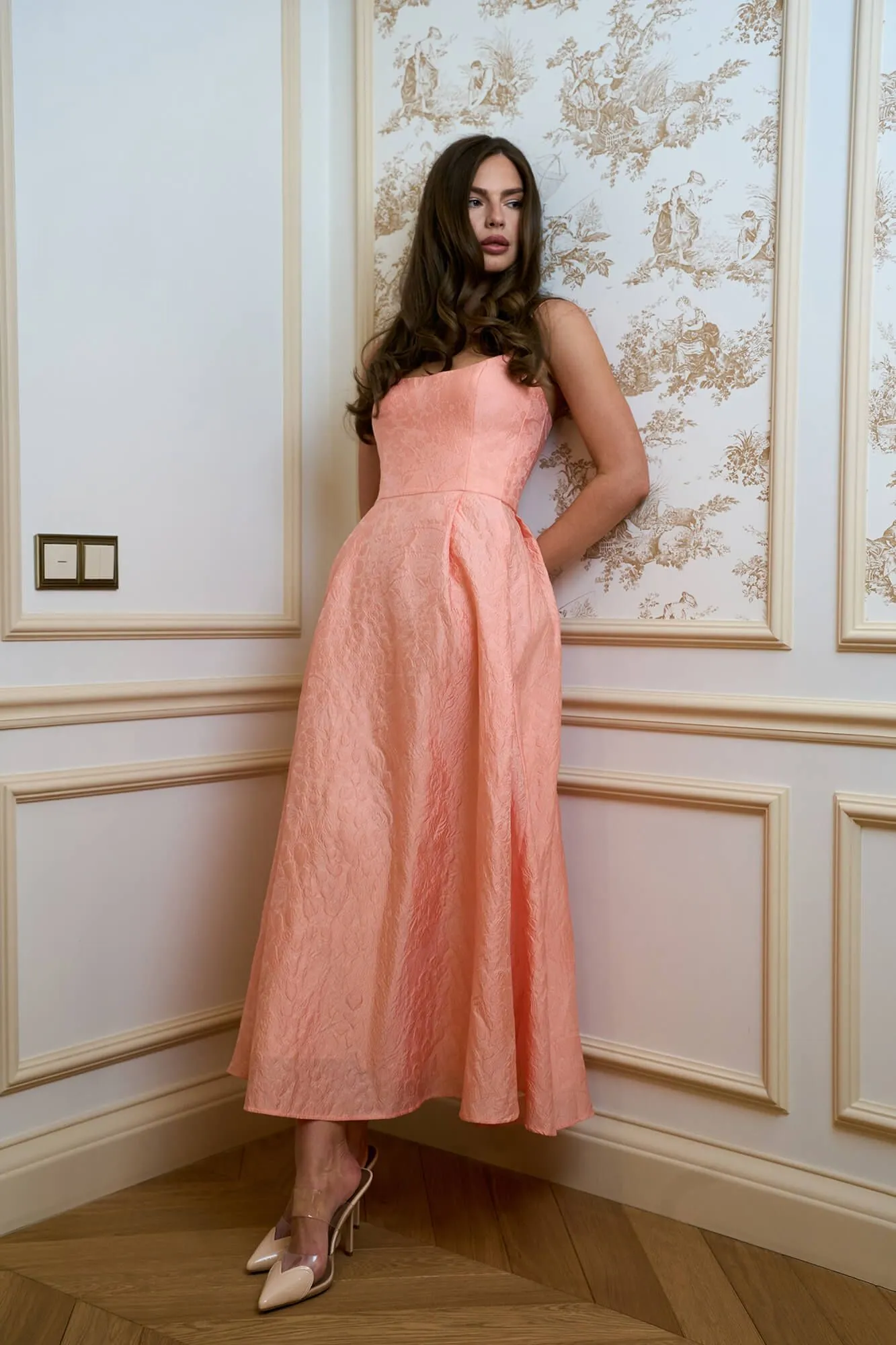 Платье-бюстье в длине миди с тонкими бретелями в коралловом оттенке. Модель выполнена из фактурной жаккардовой ткани, которая может похвастаться хорошей прочностью и стойкостью к изнашиванию. Изделие из такой ткани необычайно долго сохраняет свой первоначальный вид. Аккуратный вырез, который подчеркивает линию декольте. Корсетная основа создает акцент на талии. Пышная юбка добавляет образу лёгкости и воздушности. Прекрасным дополнением станут вечерние лодочки и клатч.