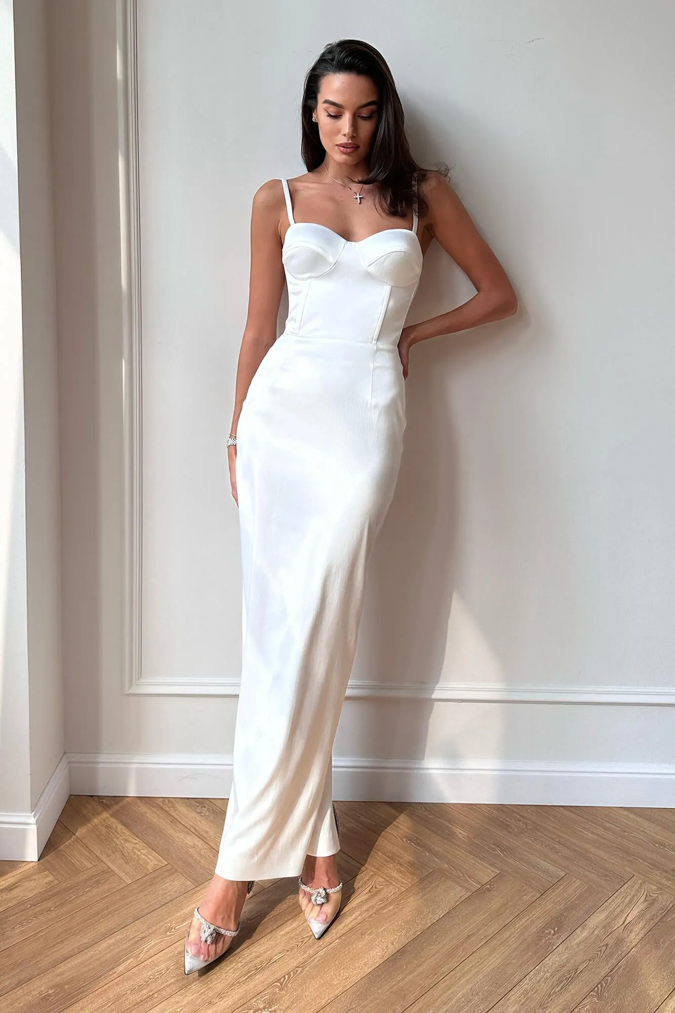 Силуэтное платье-бюстье на тонких бретелях, в длине макси, с изящным разрезом и ремешками на спине. В корсет встроены чашки и косточки, поэтому платье идеально садится в районе груди и талии. Платье на подкладке.