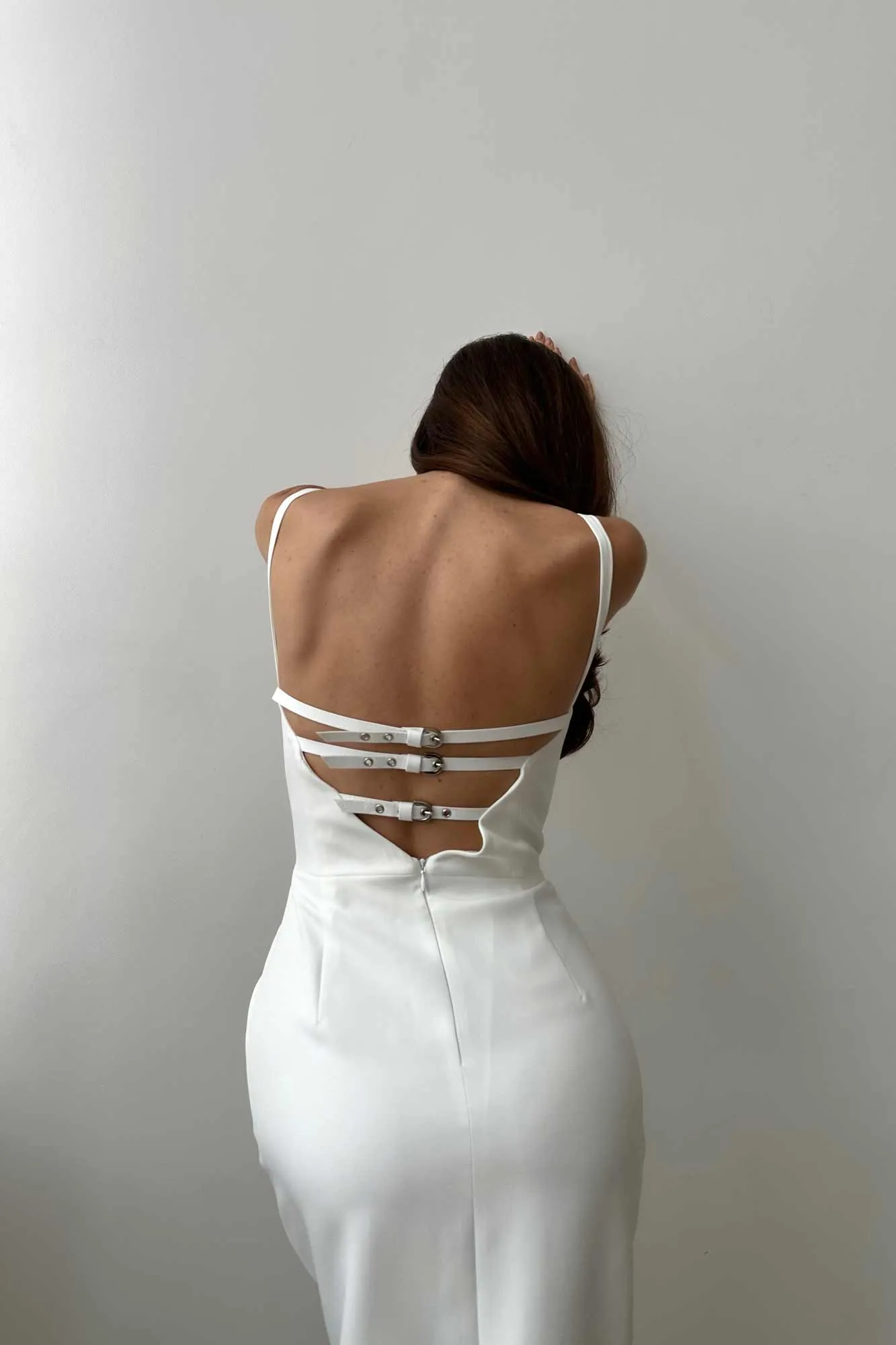 Силуэтное платье-бюстье на тонких бретелях, в длине миди, с изящным разрезом до середины юбки и регулируемыми ремешками на спине. В корсет встроены чашки и косточки, поэтому платье идеально садится в районе груди и талии. Платье на подкладке.