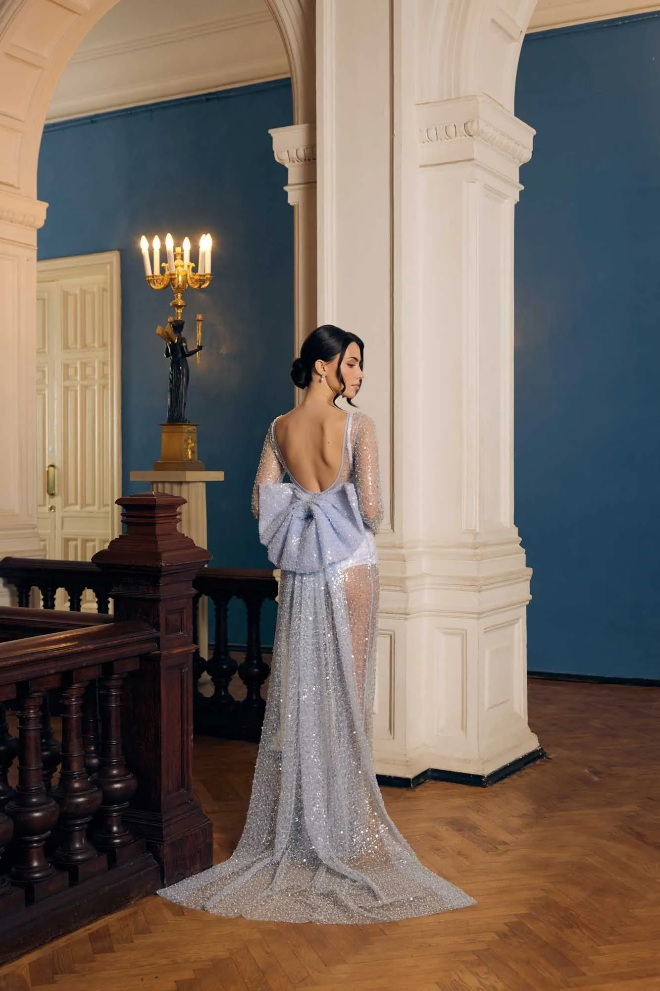 Комплект из боди и платья в пол со шлейфом и бантом. Волокно вышито стразами, бисером и стеклярусом и требует особого подхода при крое и обработке — для производственной команды эта коллекция стала вызовом. Каждый срез обрабатывается, обивается и окантовывается бельевой сеточкой вручную. Бант съемный, крепится на прозрачные кнопки. Застегивается потайной молнией сзади. Модель требует бережного обращения: аксессуары могут повредить декор. Модель выпущена в ограниченном количестве.