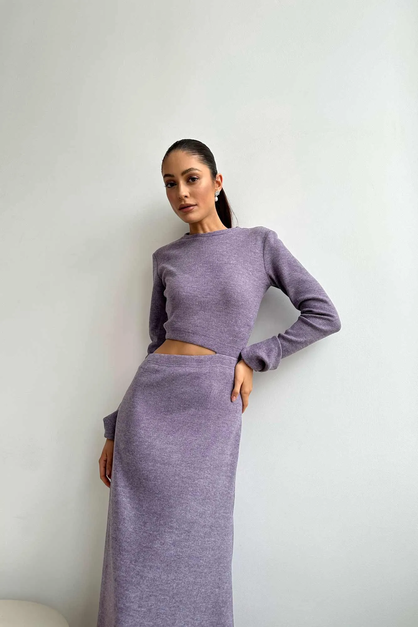Платье в длине миди из трикотажа в фиолетовом цвете. Изделие облегающего кроя выполнено из легкой струящейся ткани, которая прекрасно повторяет движения тела. Глубокий фигурный вырез на талии вместе с декорироваными длинными рукавами создают невероятно женственный силуэт и выгодно подчеркивают фигуру.