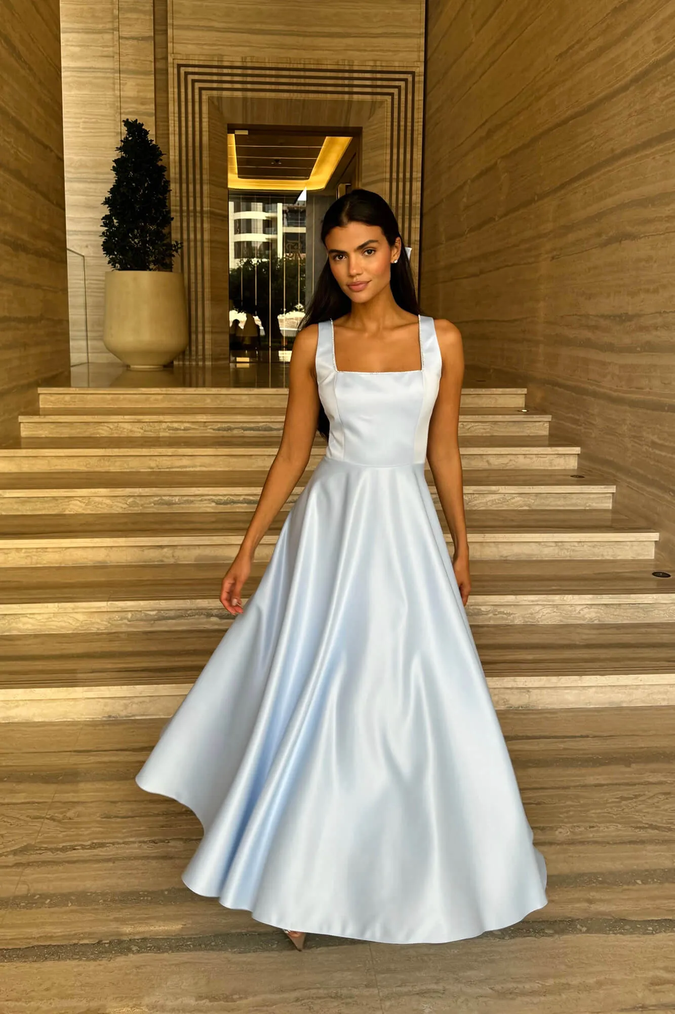 Платье в длине миди на широких бретелях в голубом цвете. Особенность платья заключается в квадратном вырезе, декорированном стразами. Изделие выполнено из плотной ткани, которая будет приятно прилегать к телу и не сковывать движения. Пышная юбка добавляет образу легкости и воздушности. Застегивается на потайную молнию.