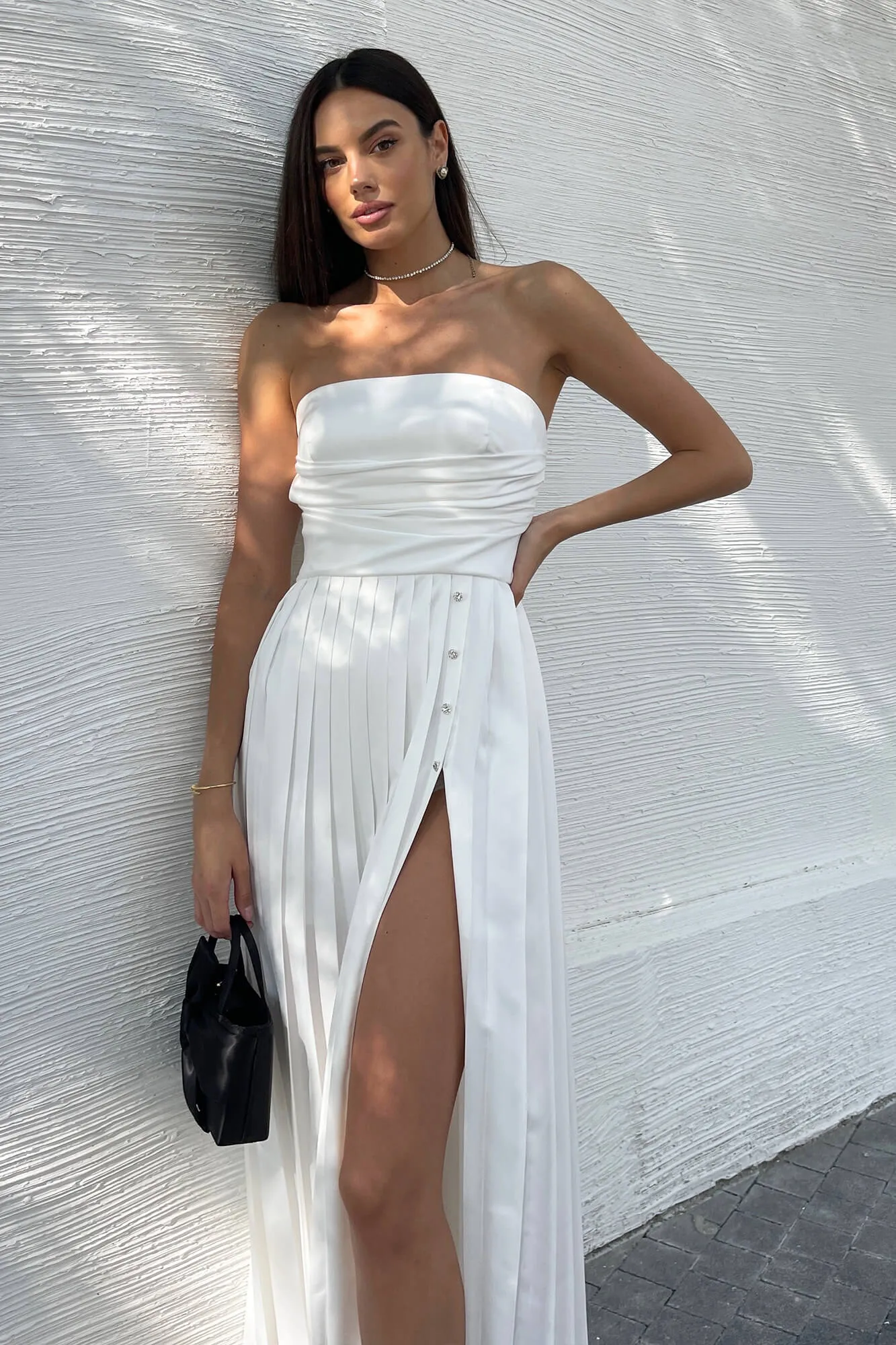 Платье-миди в молочном цвете с открытыми плечами, юбкой-плиссе и драпировкой на лифе. Изящная плиссированая юбка делает образ более нежным и романтичным. Высокий вырез по ножке, декорированный пуговицами, подчеркнет все достоинства вашей фигуры.
