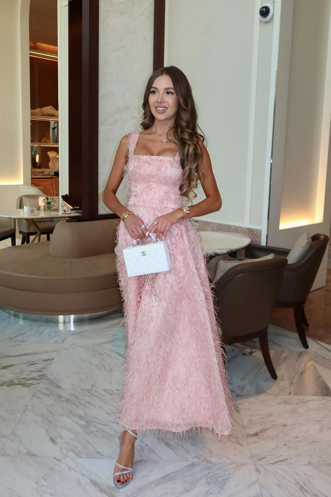 Платье-бюстье в розовом цвете на прямом корсете, с пышной юбкой в складку в длине миди. Корсет с косточками и чашками с квадратным вырезом декольте и широкими бретелями обеспечивает идеальную посадку по фигуре. Платье на подкладке.