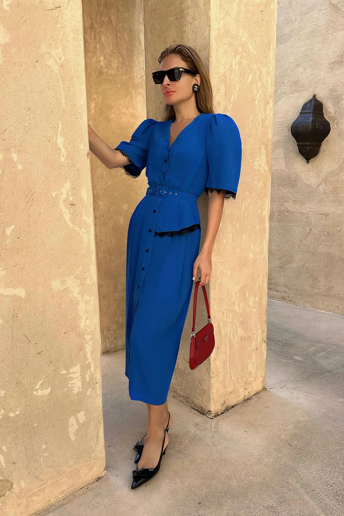 Платье в длине миди на пуговицах. Декоративные элементы отделки рукавов и юбки в виде черного кружева добавляют в образ романтичные нотки. V-образный вырез акцентирует шею и ключицы, а пояс подчеркивает талию.