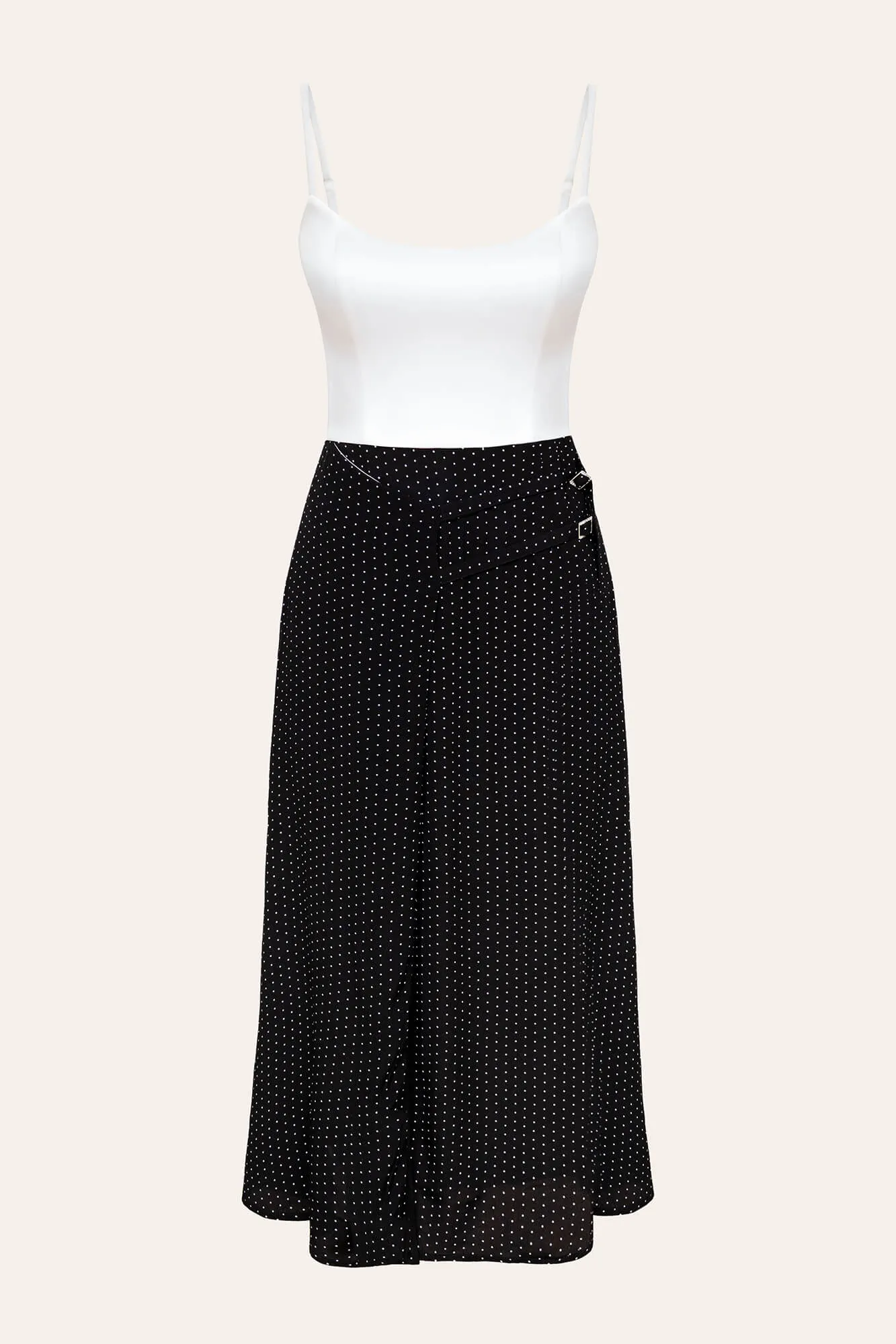 Комбинированное платье в длине миди. Жемчужный топ из атласа на тонких бретелях с глубоким фигурным вырезом подчеркнет линию декольте и ключицы, а летящая юбка на запах с декоративными ремешками добавит образу романтичности и продемонстрирует все достоинства вашей фигуры.