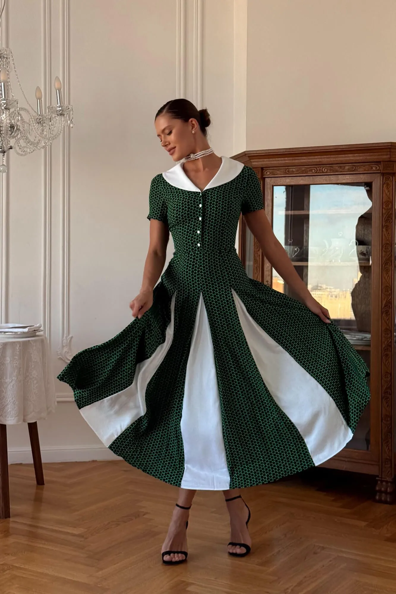Платье-миди с контрастным воротником и вставками подчеркнет элегантность и утонченность образа. Модель выполнена в темно-зеленом оттенке с мелким узором и украшена белыми вставками, которые добавляют платью динамику и визуально стройнят фигуру. Контрастный белый воротник придает наряду ретро-шарм, а аккуратная застежка на пуговицы завершает образ. Платье свободного силуэта создает эффект легкости и комфорта, а длина миди позволяет носить его как в повседневной жизни, так и на особые мероприятия.