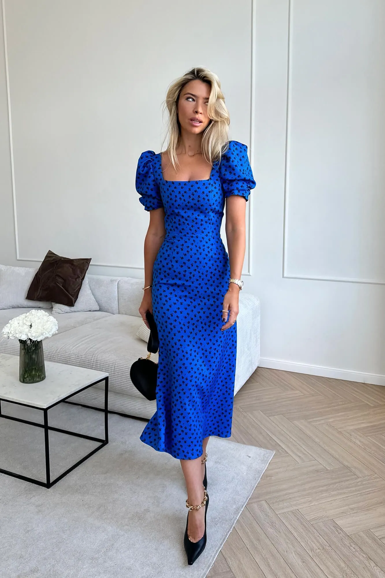Платье в длине миди в сочном синем цвете с контрастным цветочным принтом и пышными рукавами. Квадратный вырез подчеркивает декольте и визуально удлиняет шею. Модель не сковывает движения и комфортно садится по фигуре. Легкое и воздушное платье можно носить как с минималистичными лодочками, так и с босоножками