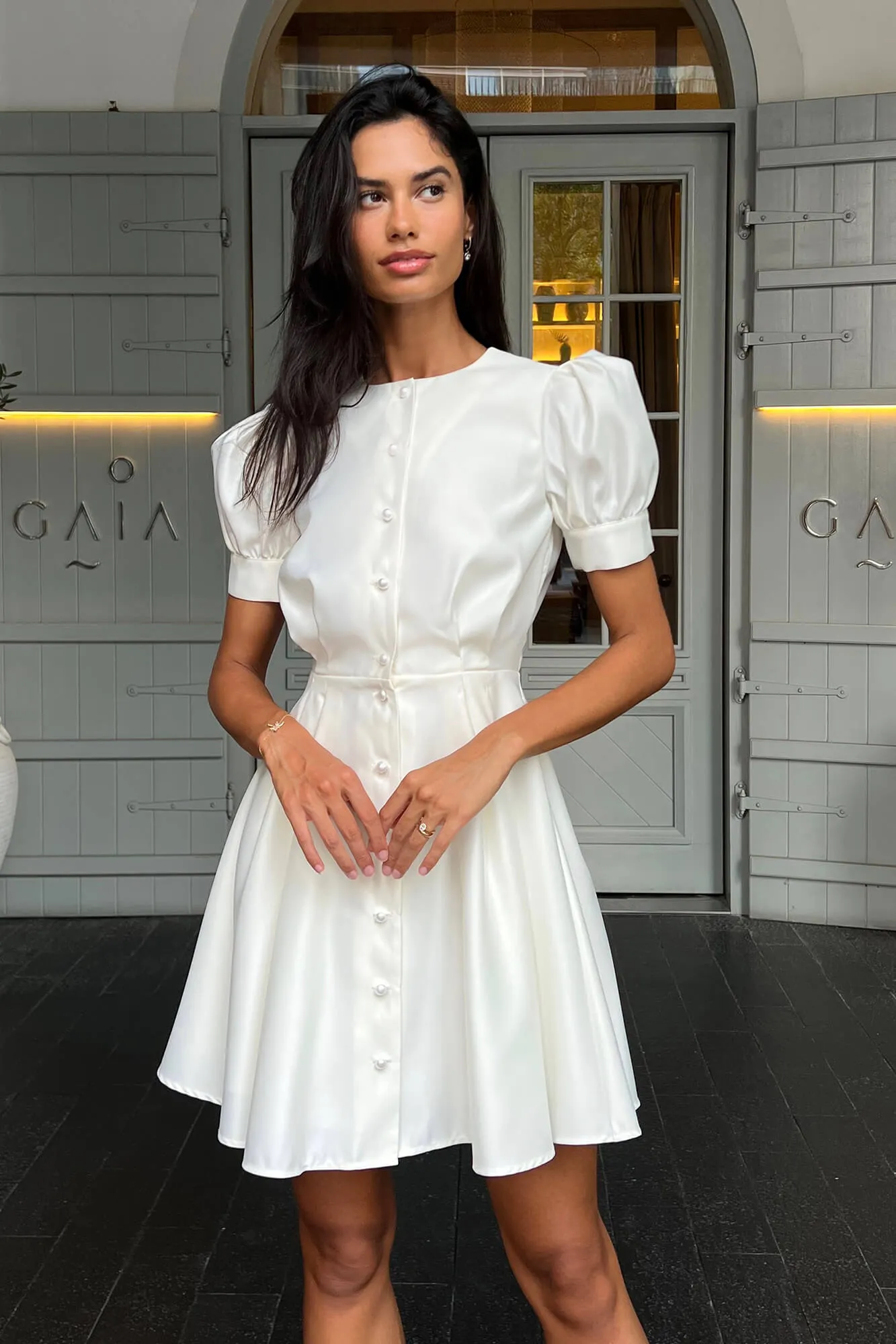 Изысканное платье в длине мини с пышной юбкой. Модель выполнена из атласа в молочном оттенке. По-настоящему особенным это платье делают рукава-фонарики, которые выполнены в легкую складку. Акцент на талии выгодно подчеркивает силуэт, а пышная юбка добавляет образу легкости и воздушности. Застёгивается на пуговицы.