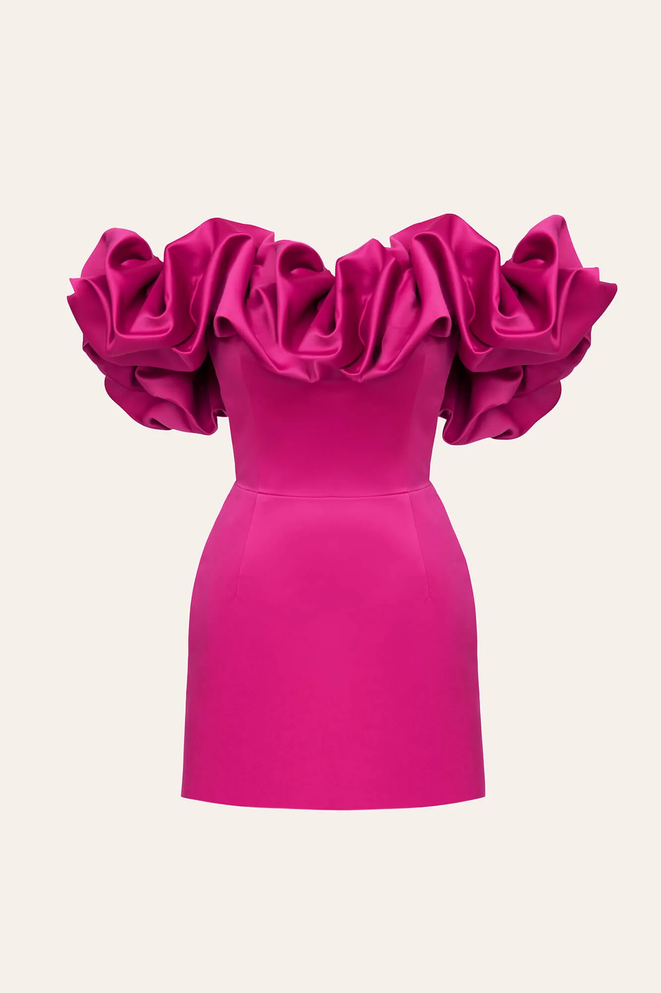 Силуэтное платье цвета фуксия, в длине мини с воздушной сборкой “Безе”. Платье выполнено на основе корсета, поэтому идеально садится в районе груди и талии за счет чашек и косточек. Модель изготовлена из плотной ткани, она хорошо держит форму и моделирует фигуру. Изделие на подкладке.