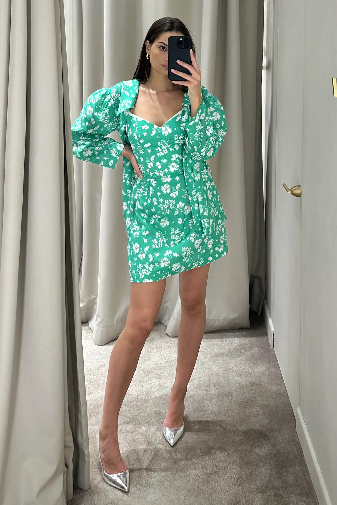 Рубашка свободного кроя с пышными рукавами и отложным воротником в зеленом цвете с нежным цветочным принтом. Идеальное дополнение к платью в тон из нашей коллекции для прохладного вечера или для завершения романтичного образа.