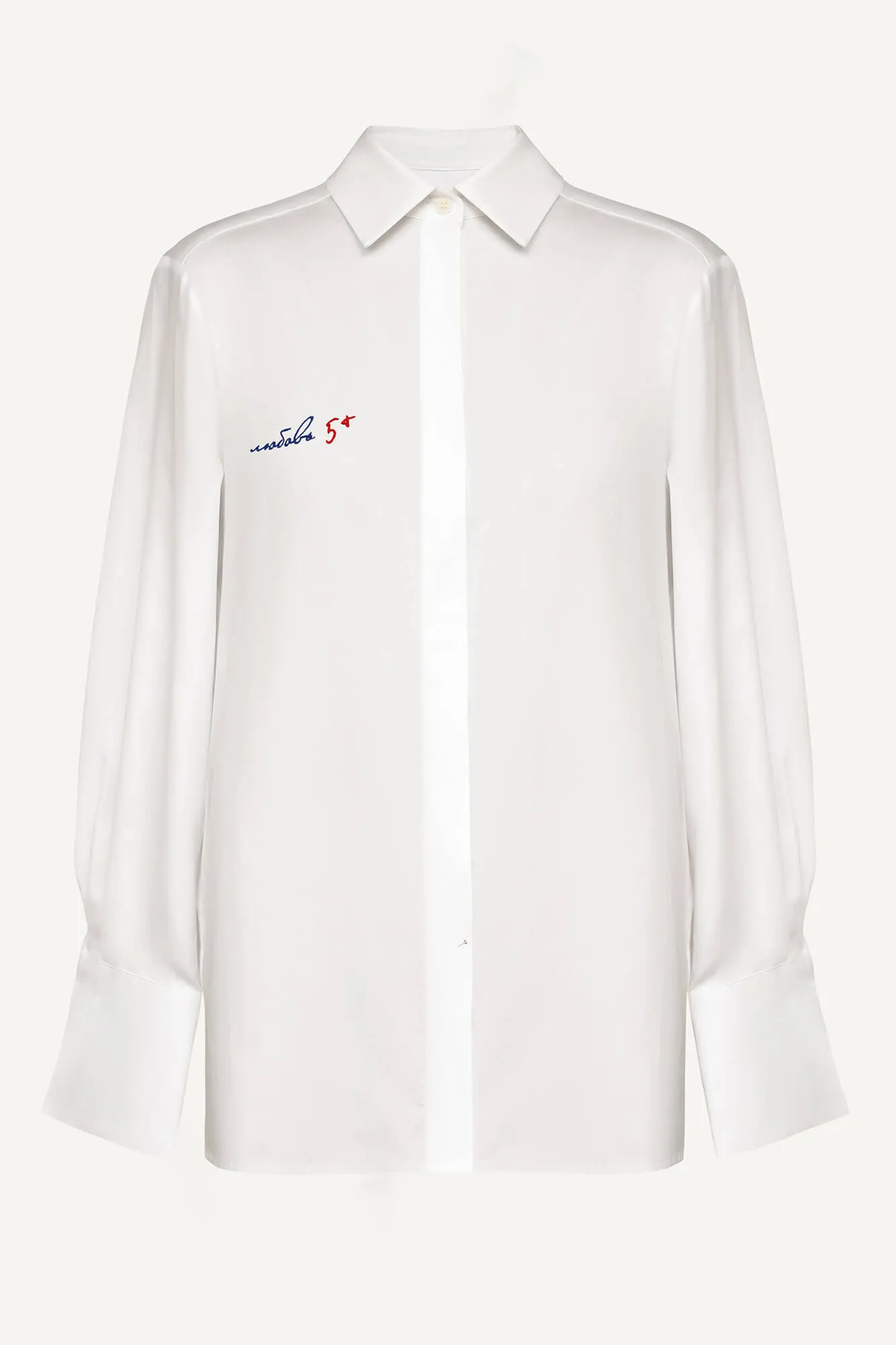 Базовая рубашка свободного кроя с длинным рукавом, высокими манжетами и оригинальной вышивкой. Легкая хлопковая ткань обеспечит комфорт в течение всего дня. Застежка на пуговицы.
