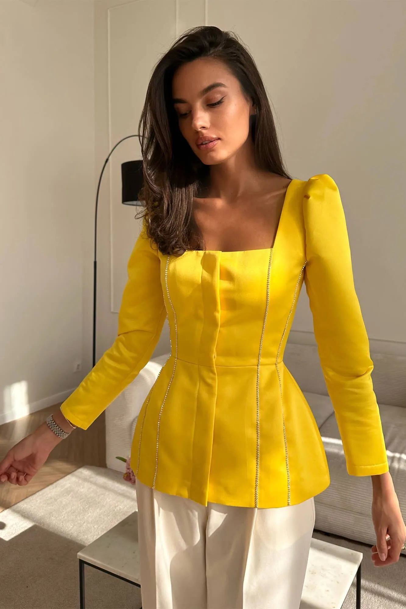 Элегантный топ из атласа с длинным рукавом. Модель приталенного кроя, украшенная на рельефах цепочками из страз. За счет плотного атласа изделие изящно подчеркивает женственность силуэта и остается комфортным. Застегивается спереди на пуговицы.