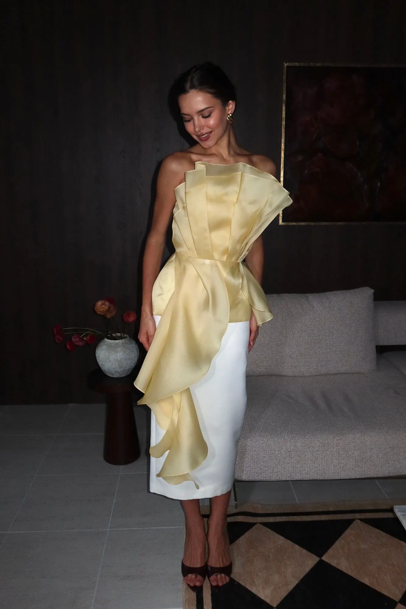 Корсетный топ из шелка с декором. Изделие сложное не только визуально, но и конструктивно, чтобы вы чувствовали себя особенной. Вертикальные драпировки, декор в виде листьев и длинные воланы добавляют топу изящности и женственности. Застегивается потайной молнией сзади. Сочетайте с брюками палаццо или юбками макси, чтобы «уравновесить» открытость верха!